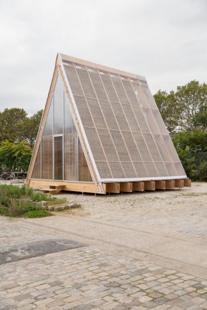 Le choix d’un module triangulaire a été fait dans une logique à la fois structurelle, économique et symbolique. La couverture transparente permet de rendre visible toutes les couches du projet, composé de panneaux de bois massif CLT, d’une charpente bois lamellé-collé, d’une isolation paille et de murs Trombe en terre crue.
