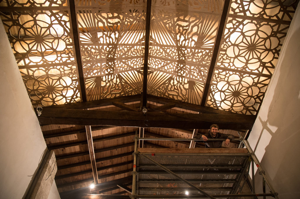 Dans l’exposition « une forêt d’art contemporain », le contreplaqué TeboPin, a été sculpté à la façon d’un moucharabieh en bois. L’artiste Ladislas Combeuil est ensuite venu en recouvrir le plafond de la chapelle des Bouricos à Pontenx-les Forges (40). Rétro éclairé, le contreplaqué TeboPin ainsi découpé joue le jeu de la lumière qui passe dans les surfaces ajourées créant une répétition de formes géométriques.